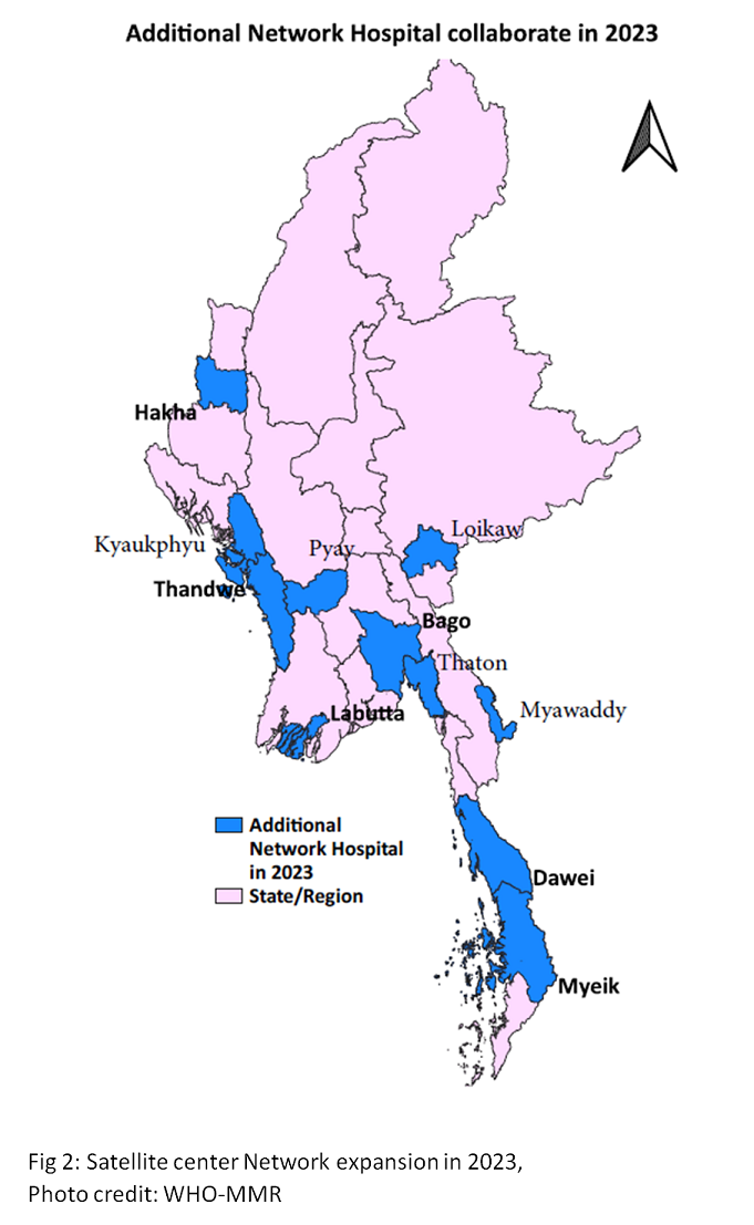 Yangon Children’s Hospital was nominated by the Ministry of Health to participate in SEAR-CCN and lead the change working along the global initiative.Yangon Children’s Hospital actively participated in the network activities and increased collaboration with fellow institutions. One such collaboration involved that with Kati Children’s Hospital in Nepal, by way of which the two hospitals shared the experiences of leading similar initiatives in similar circumstances benefiting both. GICC continued support to the Myanmar initiative. The number of satellite center network hospitals increased from 17 in 2019 to 41 in 2023. Figure 1 & 2 show network hospitals identified in 2019 and additional network hospitals collaborating in 2023 respectively.