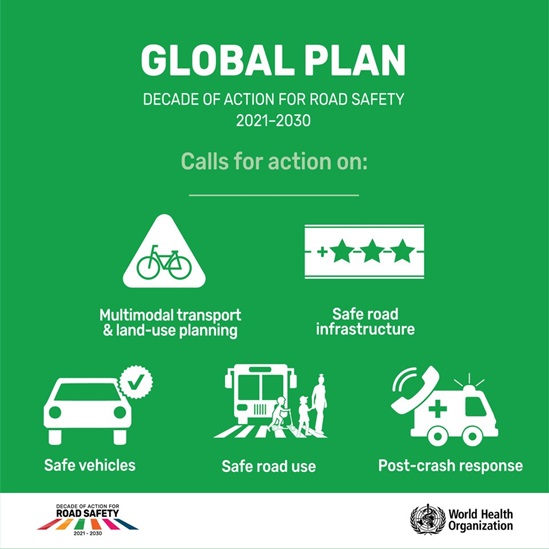 The Global Plan aligns with the Stockholm Declaration, by emphasizing the importance of a holistic approach to road safety, and calling on continued improvements in the design of roads and vehicles; enhancement of laws and law enforcement; and provision of timely, life-saving emergency care for the injured. The Global Plan also reflects the Stockholm Declaration’s promotion of policies to promote walking, cycling and using public transport as inherently healthy and environmentally sound modes of transport.